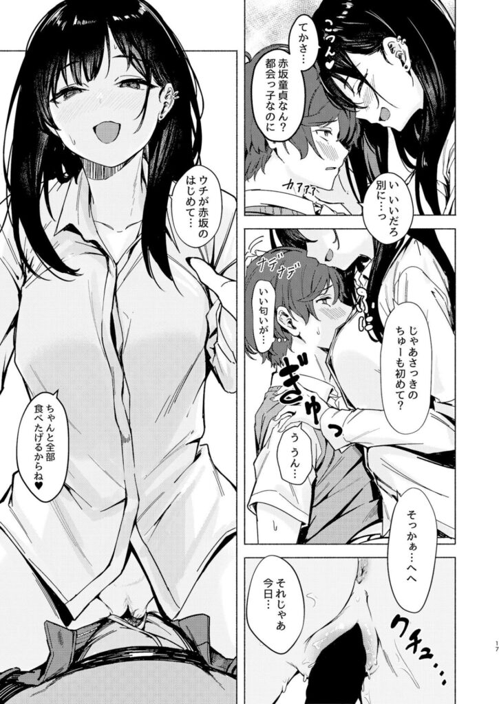 日々ひそかに自分を慰めながら過ごしている彼女が、やっと信頼できる男性と出会い、心も身体も素直に開く瞬間。その小さな大胆さや、興奮しすぎる彼のおちんちんを見て「ざっこ」と笑ってしまう無邪気さに、思わず胸がエロきゅんとなります。